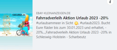Das ist doch mal ein Hammerangebot – das solltet Ihr nutzen wenn Ihr im nächsten Jahr nach Scharbeutz kommt ? Tobis Rad ist DER tolle familiäre Fahrradverleih bei uns.