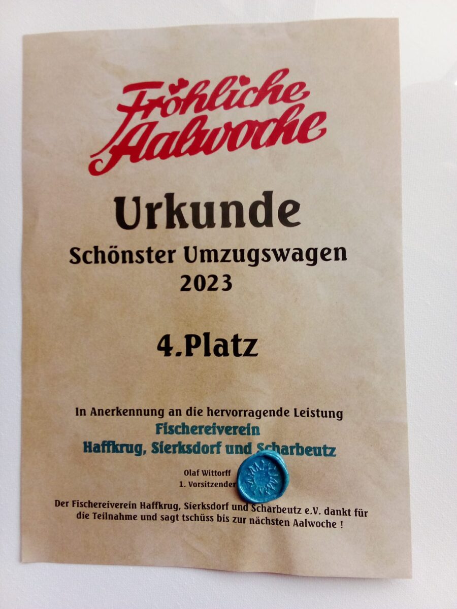 Wir konnten bei der Aalwoche in Haffkrug, Sierksdorf und Scharbeutz einen wunderbaren 4. Platz ergattern mit unserem Umzugswagen der „Beach-Cleaner“ und haben dafür u.a. eine tolle Urkunde bekommen…